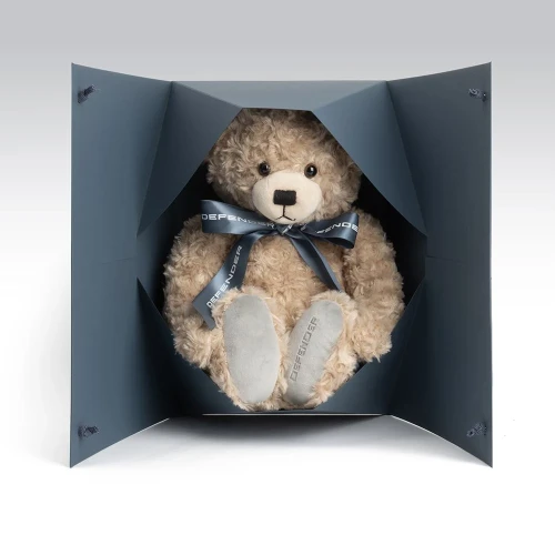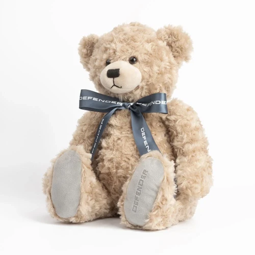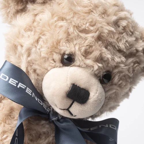 35 cm høy (sittende) plysjbamse. Defender-logo på halsbåndet og på poten. Supermykt pelsstoff med polyesterfyll. Egnet for alle aldre.