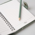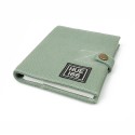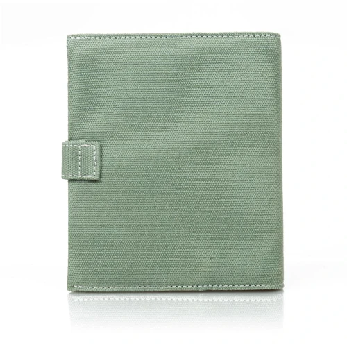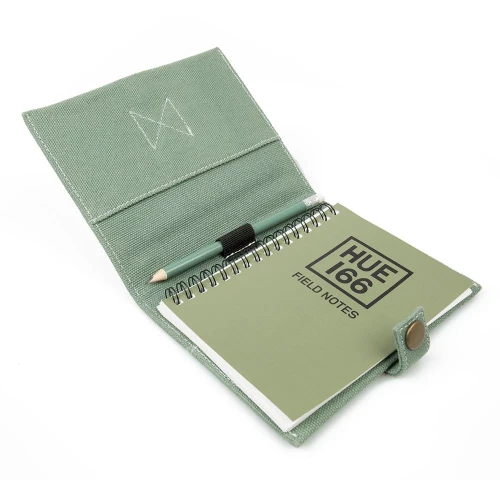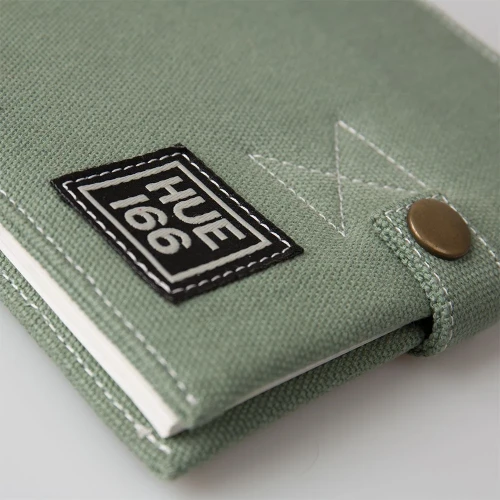 HUE notatbok og organiser i canvas med grå kontrastsøm og praktiske lommer for oppbevaring. Har et HUE 166-preget lærmerke og et brodert heritage-logo
