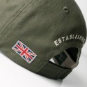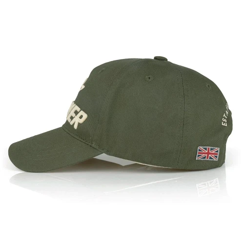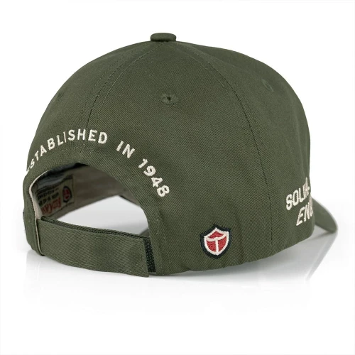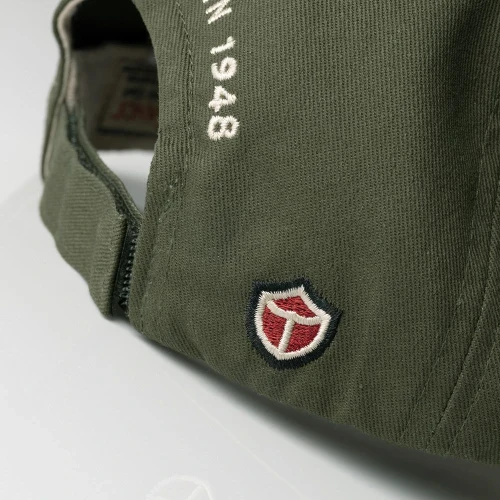 Laget av bronsegrønn 100 % bomullstwill, med to andre broderte merker og et vevd flagg.
